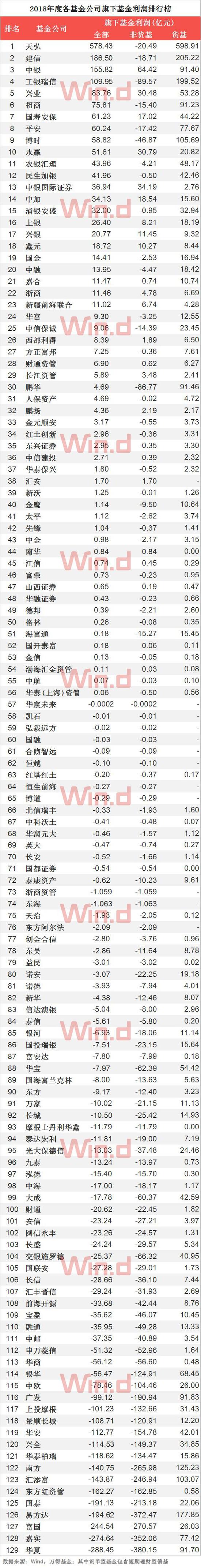 从基金公司角度来看,2018年天弘基金以578.43亿的利润总额居首,建信基金、中银基金以186.5亿和155.82分列第二和第三名。